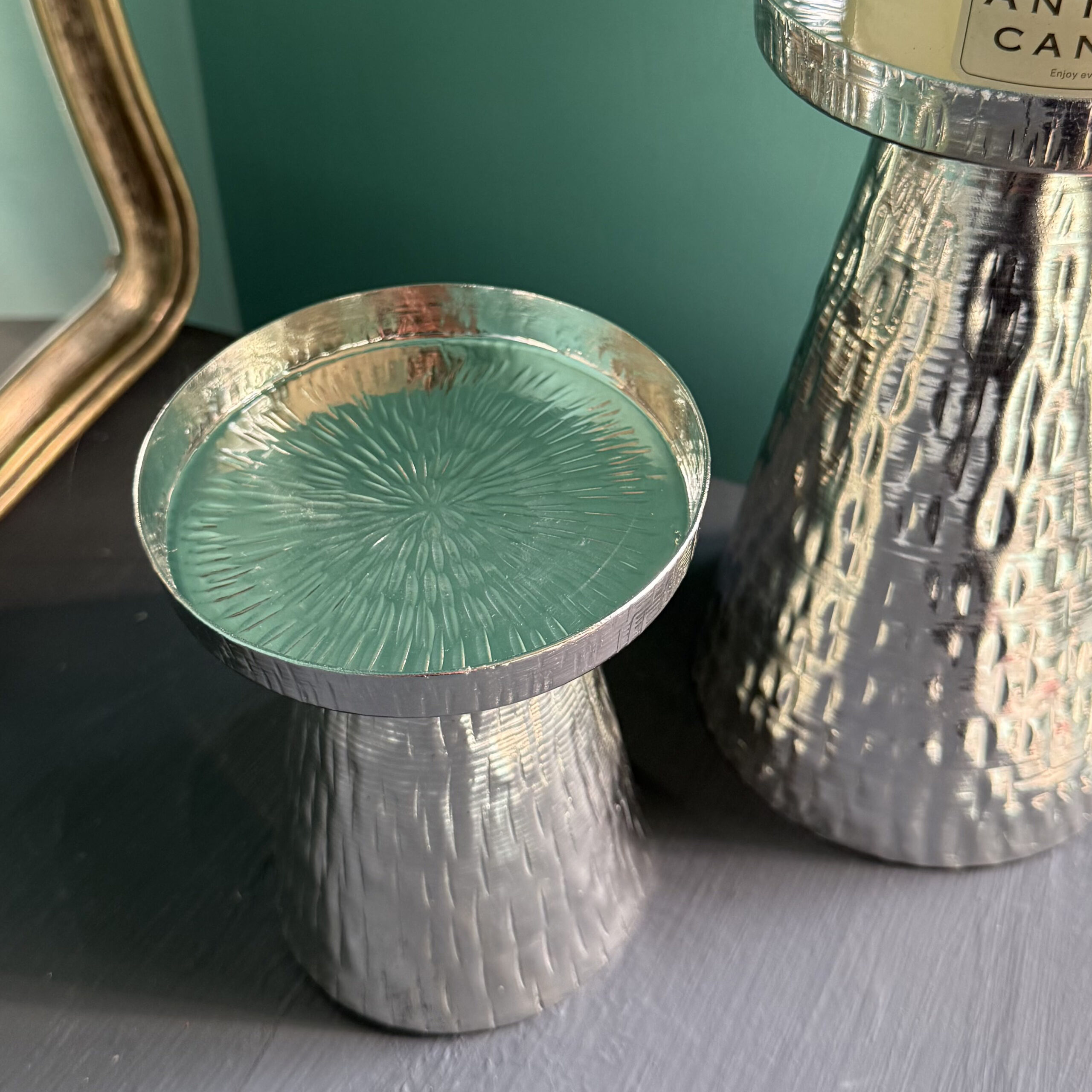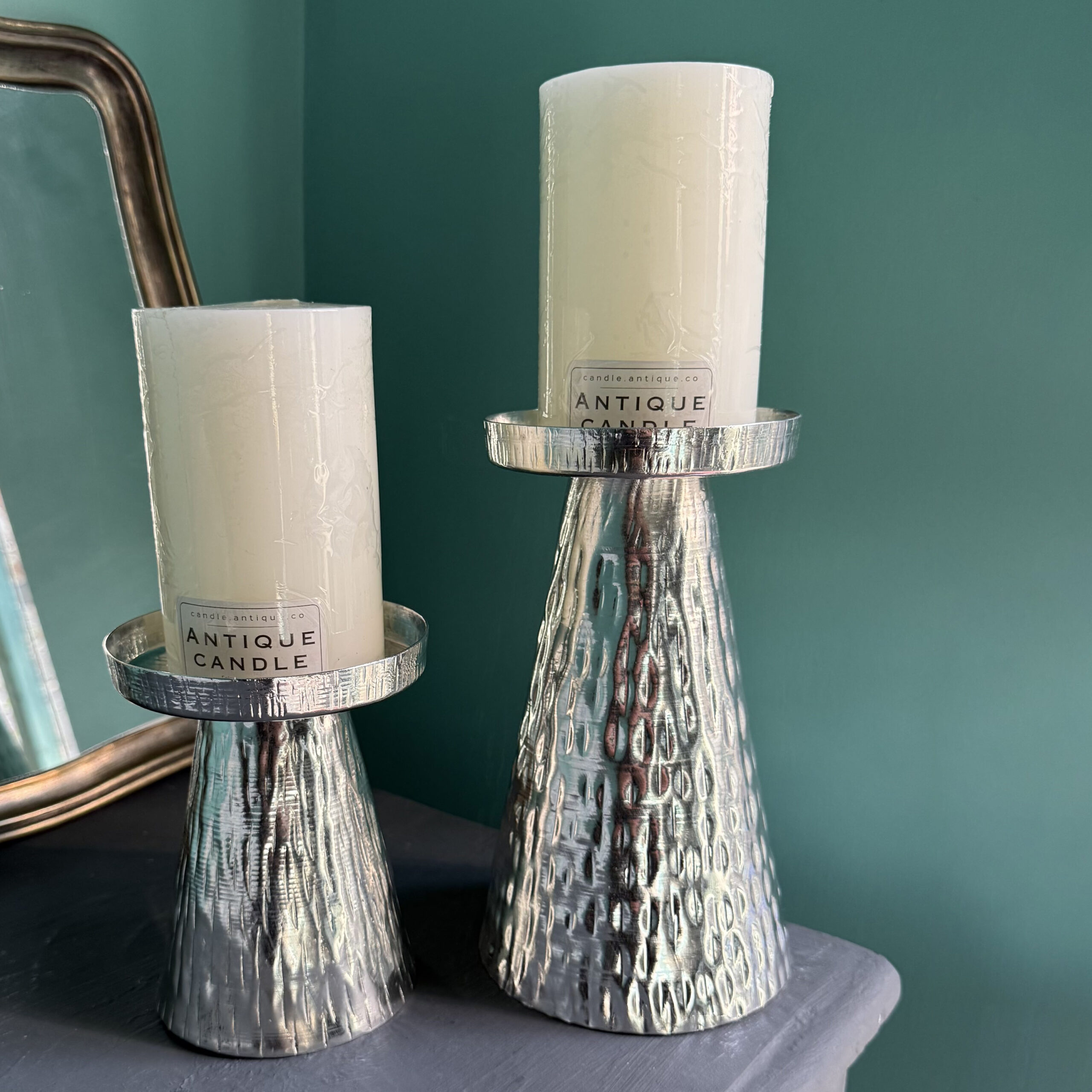 شمعدان پایه قیفی مسی ساخت کرمان با چکش کاری خطی در دوسایز موجود می باشد.