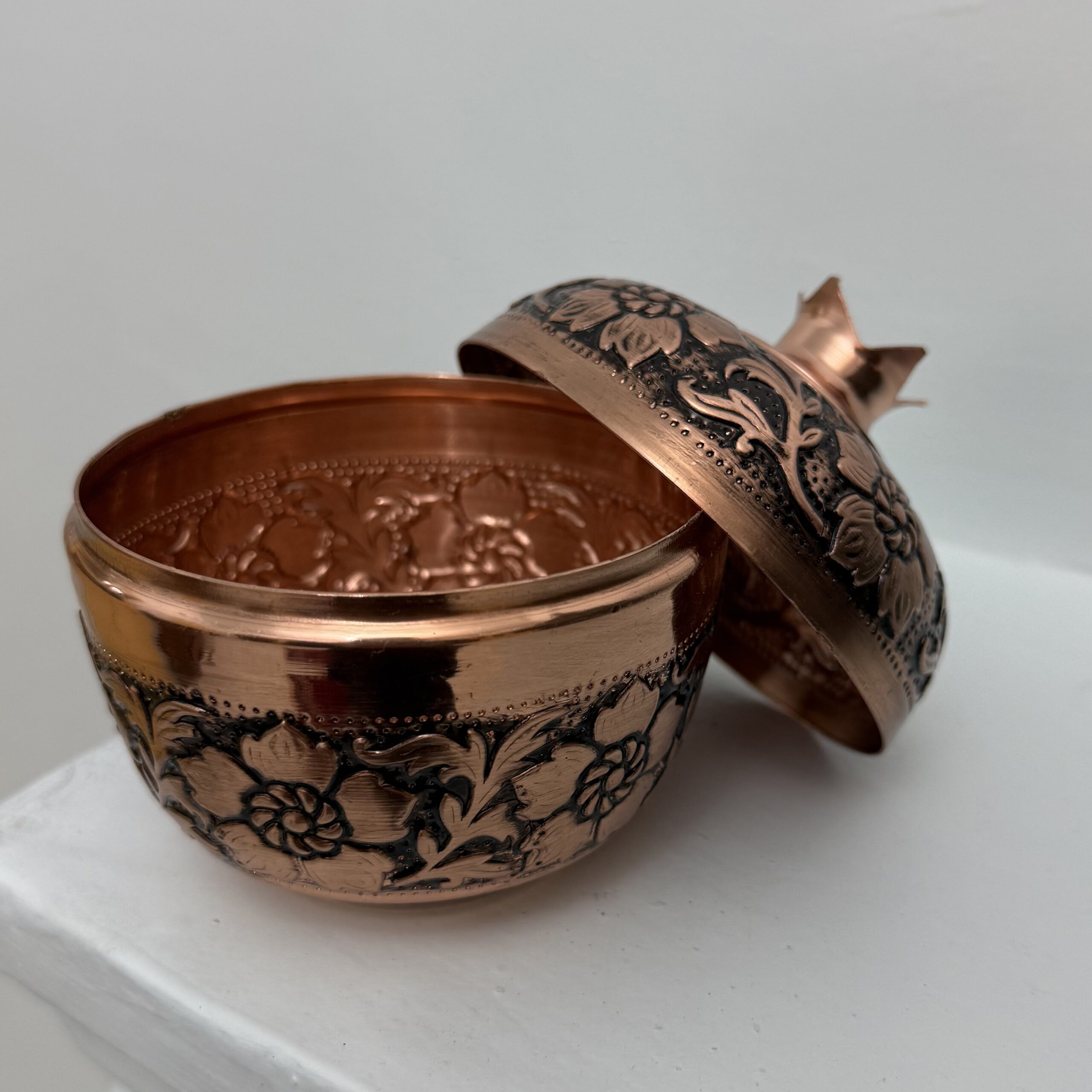 قندان انار مسی قلمکار به همراه رنگ ثابت، نانو شده در سه سایز مختلف موجود می باشد.