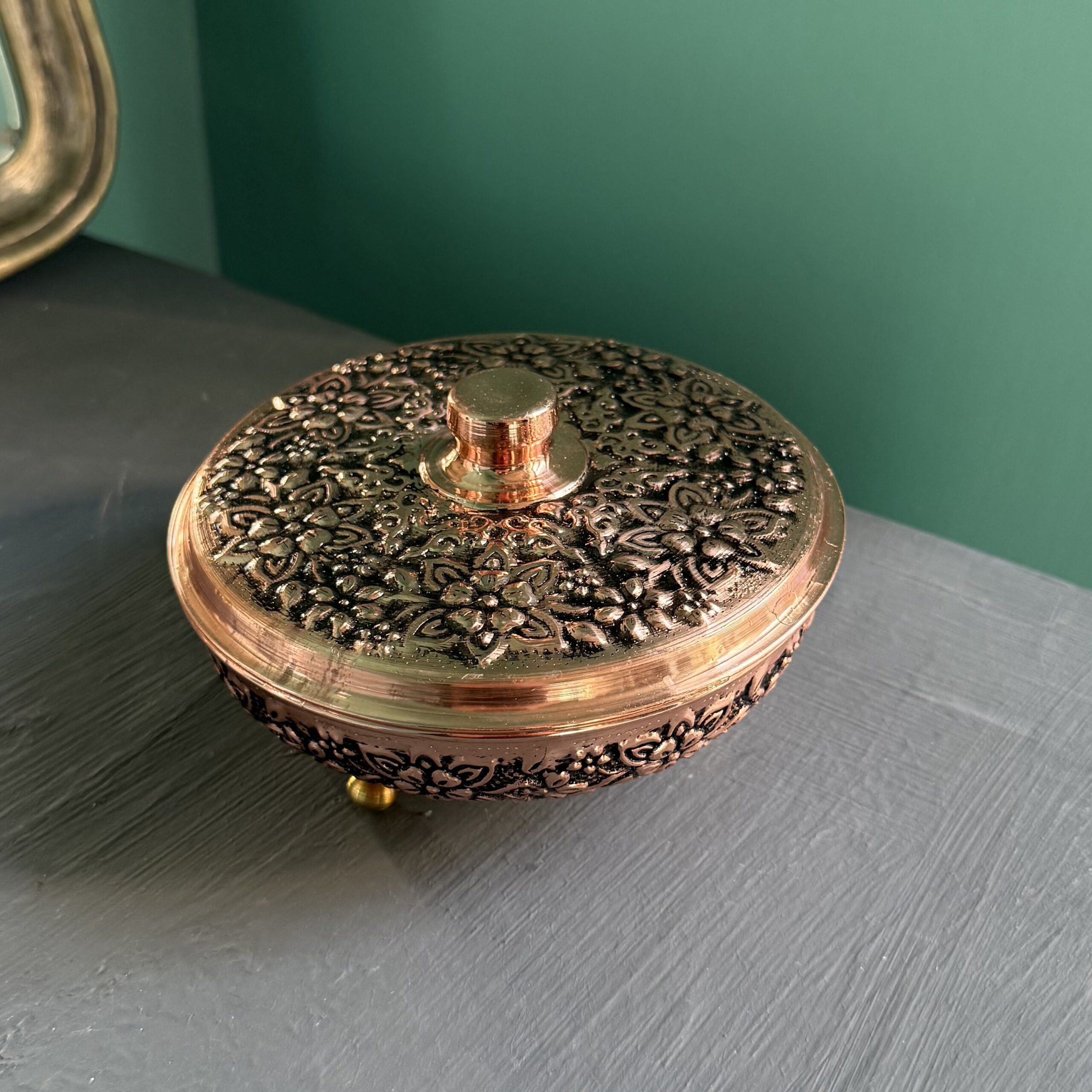 قندان مسی تابان سه پایه برنجی با قلم ماشینی نانو شده بدون تغییر رنگ