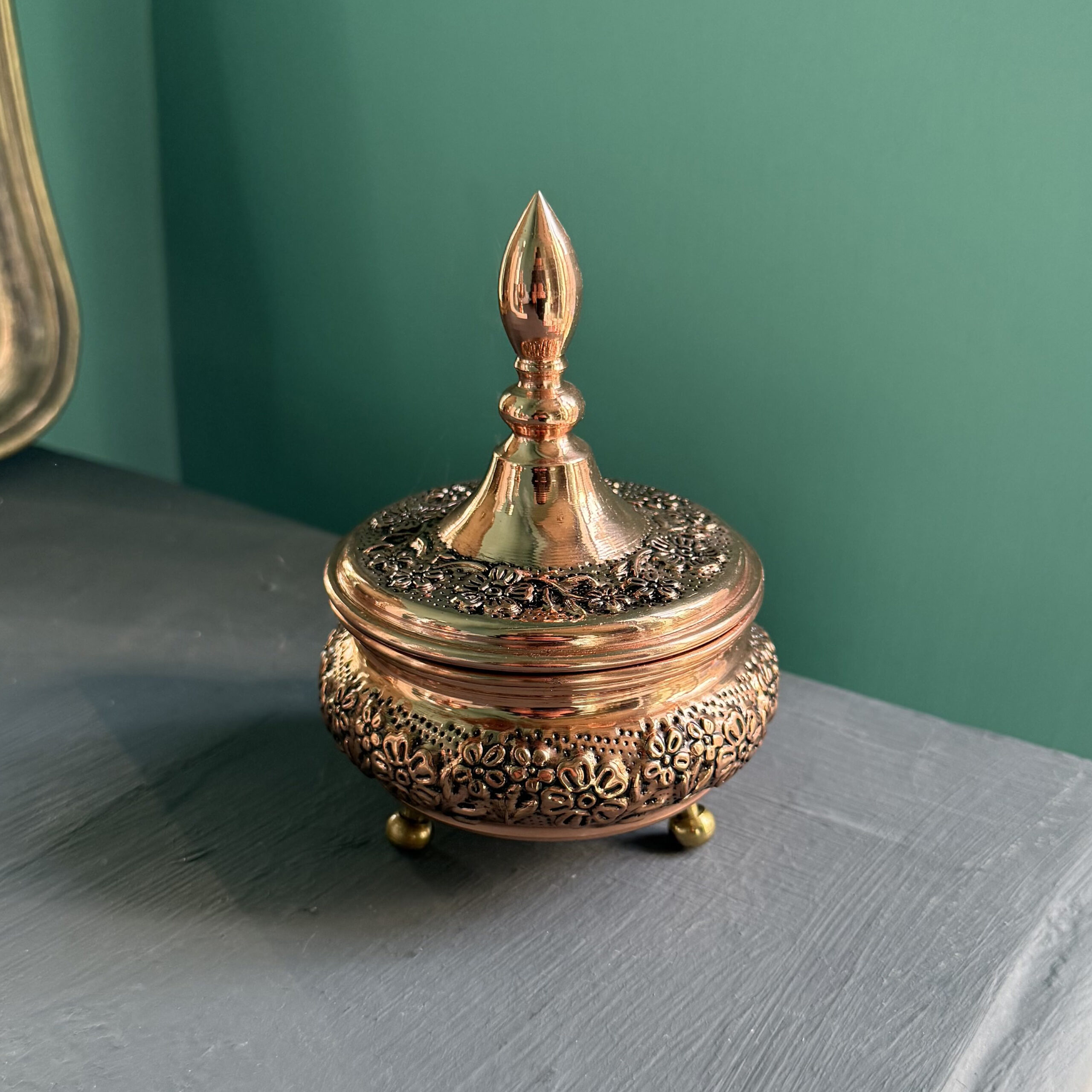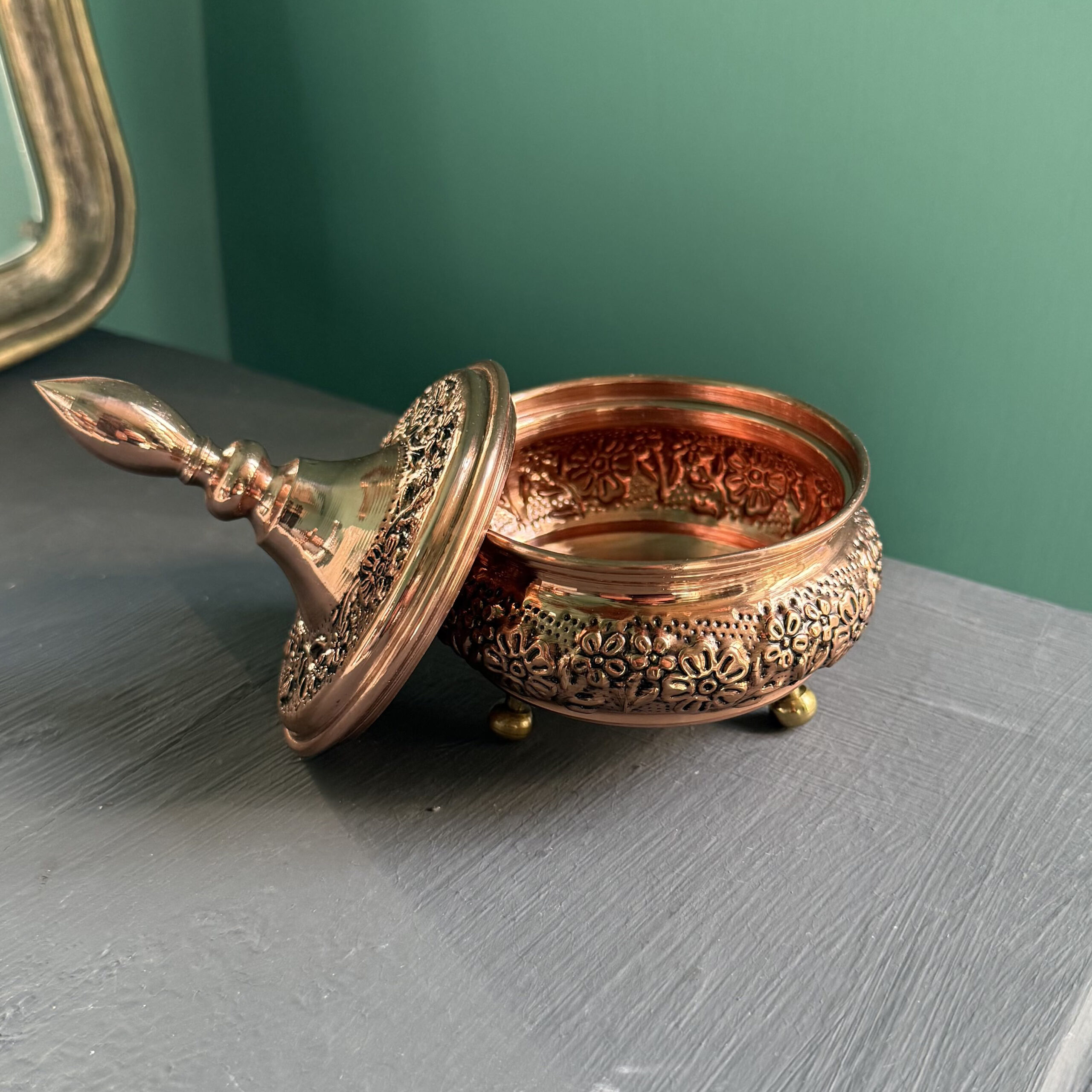 قندان مسی ترمه سه پایه برنجی با قلم ماشینی نانو شده بدون تغییر رنگ