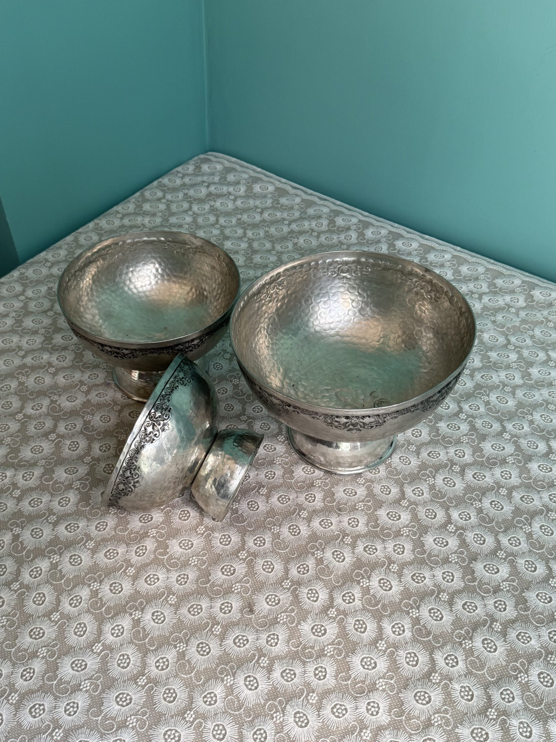 کاسه مسی قلمکار پایه دار ساخت هنرمندان کرمانی با تکنیک چکش کاری شده و قلمکاری شده توسط هنرمندان اصفهانی با رنگ ثابت ساخته شده.